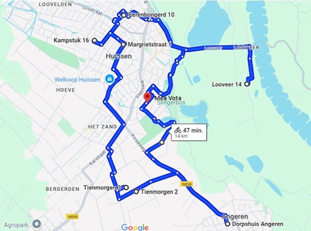 De route is op deze site bijgevoegd. De gehele flyer ligt binnenkort bij winkeliers en openbare gelegenheden in Huissen en Angeren en op 21 en 22 juni natuurlijk bij de adressen op de route.