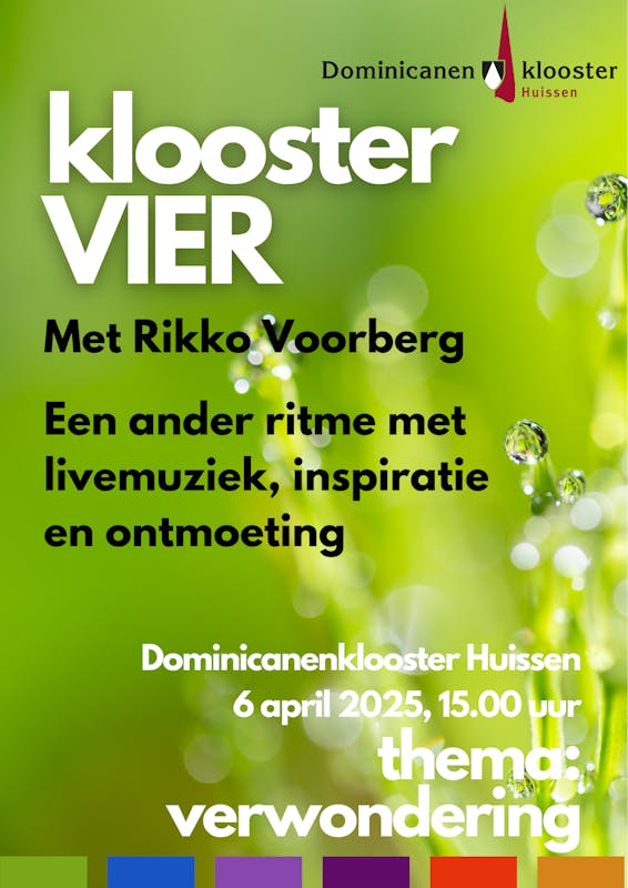 Dominicanenklooster Huissen organiseert vier keer per jaar KloosterVIER, een inspirerende zondagmiddag waarin we je meenemen in een ander ritme, met livemuziek, een inspirerend verhaal en een moment om elkaar te ontmoeten. In 2025 staat het thema verwondering centraal.