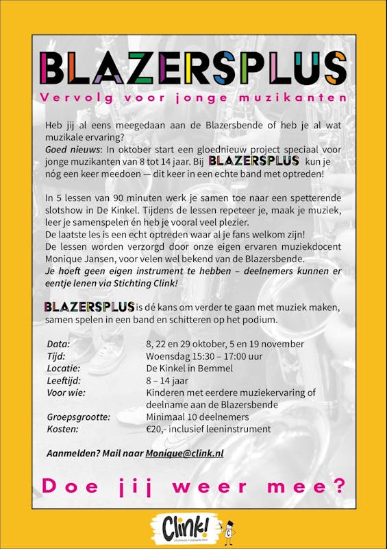 Heb jij meegedaan aan de Blazersbende of heb je al wat muzikale ervaring? Dan is dit je kans om een stap verder te gaan! In oktober start Blazersplus: een muzikaal vervolg speciaal voor kinderen van 8 tot 14 jaar.