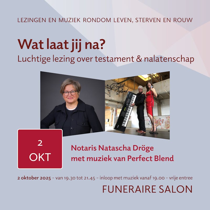 Wat moet je regelen voor later? En wat is eigenlijk het verschil tussen een testament en een levenstestament? Welke keuzes heb ik als het gaat om mijn nalatenschap? Tijdens de eerste Funeraire salon van dit seizoen legt notaris Natascha Dröge – Steenbergen uit Arnhem het op een heldere en menselijke manier uit. Geen moeilijke taal, wél handige inzichten en veel interactie. Met live muziek van Perfect Blend (Mareen Medema & Jaap Schoenmakers), een hapje en een drankje wordt het een sfeervolle avond vol informatie én beleving.