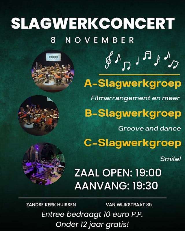 Op zaterdag 8 november nodigen de slagwerkgroepen u uit voor een betoverende muzikale avond. Het thema van deze avond is “Filmmuziek”. Laat u meevoeren door de diversiteit van de muziek die onze slagwerkgroepen ten gehore zullen brengen. Met prachtige melodische instrumenten zoals marimba’s, xylofoon en pauken, belooft het een avond vol muzikale verrassingen te worden. Kom en geniet van een onvergetelijke avond!