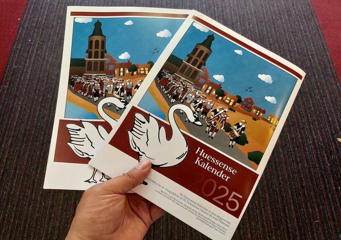 De traditie van de Huissense kalender. Ook deze keer hebben de Gildebroeders en zusters weer een schitterende kalender gemaakt voor het jaar 2025. Tijdens de Huissense dag was traditiegetrouw de primeur van de Huissense kalender. Met prachtige afbeeldingen van Huissens in al zijn vormen. Zo hebben de samenstellers in der loop der jaren al heel wat moois van Huissen laten zien. In deze editie, die ook weer geheel in kleur is uitgevoerd, is wederom aandacht aan de omgeving besteed.