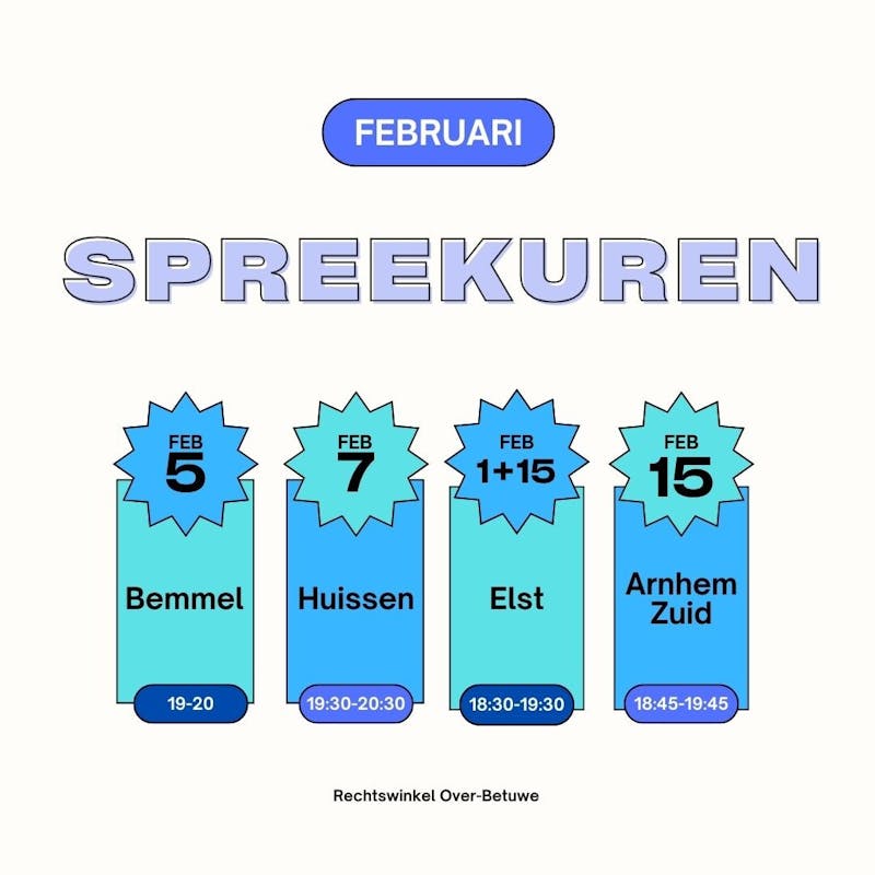 Aan onze services zijn geen kosten verbonden, onze werkzaamheden verrichten wij namelijk op vrijwillige basis. Hebben wij uw interesse gewekt? U bent van harte welkom op het eerstvolgende spreekuur, dat 7 februari a.s. in het Zilverhuus zal plaatsvinden van 19:30-20:30. Op onze Instagram-pagina (@rechtswinkeloverbetuwe) plaatsen wij maandelijks op welke data en tijdstippen wij spreekuur draaien in Huissen, maar ook in Bemmel, Elst en Arnhem-Zuid. We zijn tevens per e-mail bereikbaar via .