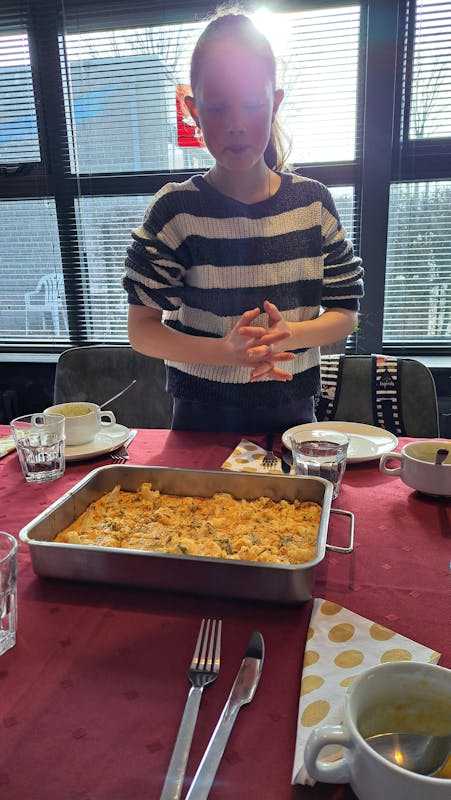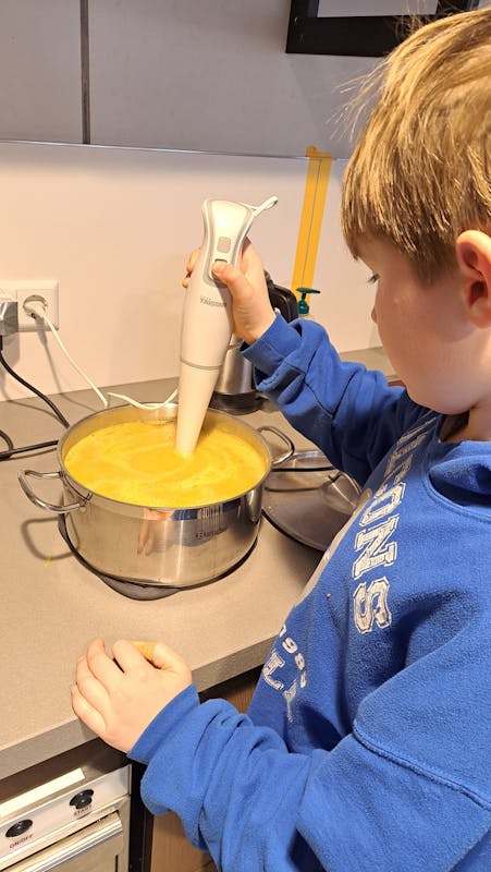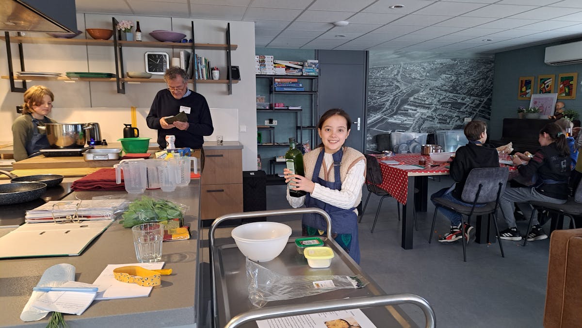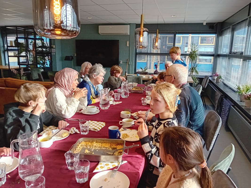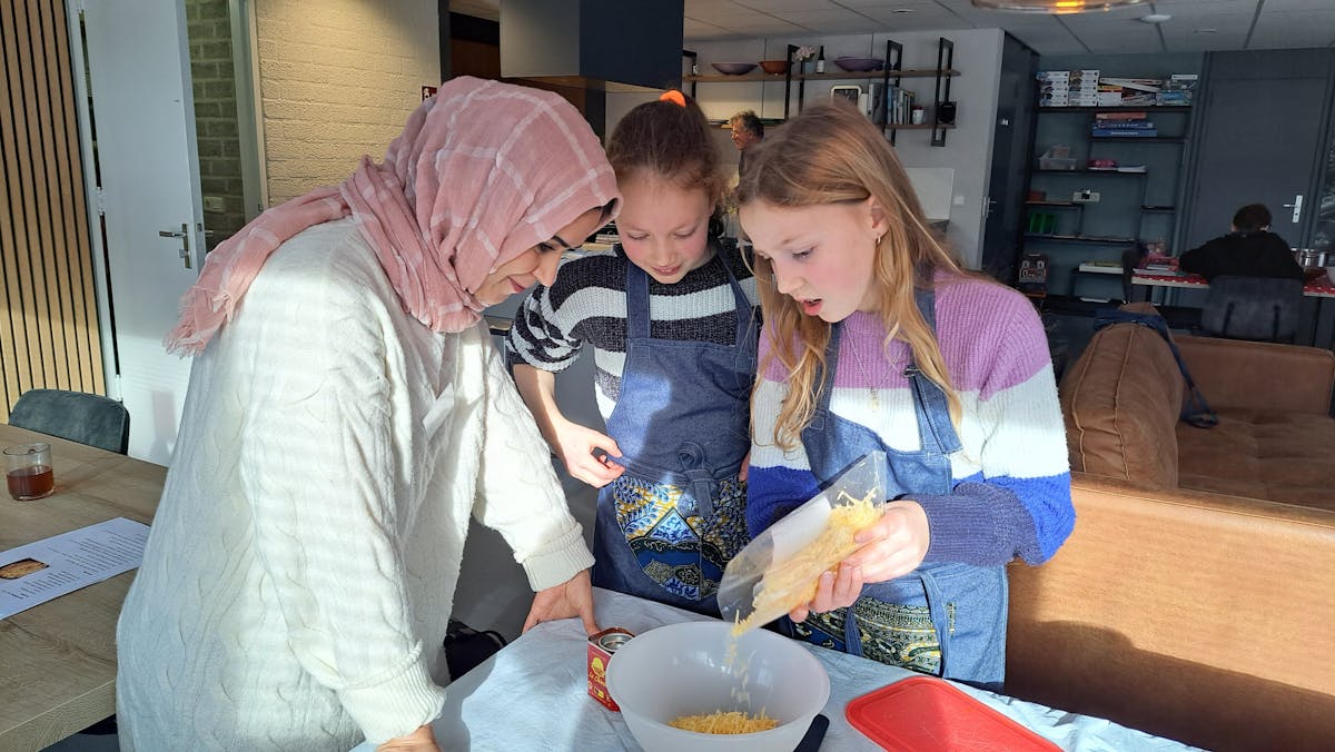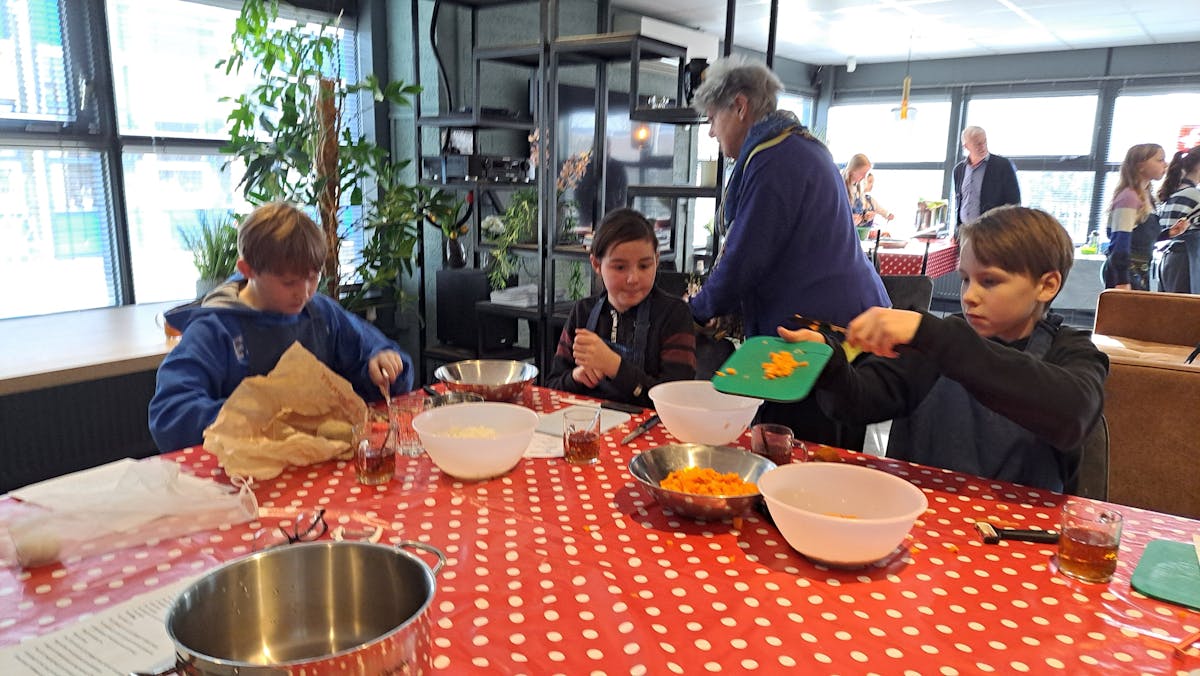 Vorige donderdag kookte de ene helft van het wolvenbos van groep 7 van IKC het Holthuus. Deze week kwam de andere helft aan de beurt in het Zilverhuus. Ook zij kookten ze internationaal: Irakese linzensoep en Spaanse bloemkoolfrittata. Twee uur beschikbaar om de 100 meter van klas naar de keuken van het Zilverhuus te lopen tot het gezond doorvoed verlaten van het pand. Daar tussenin gebeurt heel veel: indelen werkgroepjes, handen wassen, recept lezen, ingrediënten uitzoeken, afwegen, snijden, bakken, of koken, tafeldekken, samen gezellig eten en afwassen. Dat lukt de ene keer beter dan de andere keer. Op een klein stukje afwas na, ging dat ook deze keer weer goed.