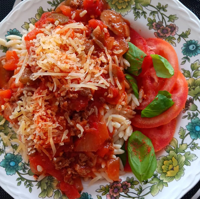 Schep de kritharaki op het bord en doe er saus over. Geraspte kaas en een beetje paprikapoeder eroverheen.