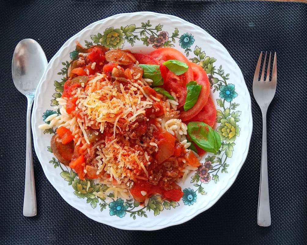 Olijfolie, gehakt, ui, champignons, paprika, knoflook en kruiden zoals zout, peper, tomatenblokjes (pakje of blikje) tomatenpuree (2 kleine blikjes) paprikapoeder, kerrie, basilicum, oregano en majoraan, geraspte kaas, verse basilicum.