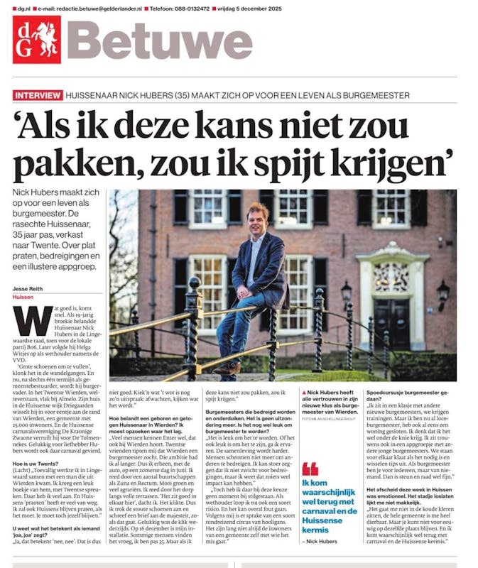 Vanmiddag kon men afscheid nemen van Nick Hubers tijdens drukbezochte receptie in De Buitenpoort. Familie, collega’s, inwoners en verenigingen kwamen samen om de 35-jarige Huissenaar succes te wensen.