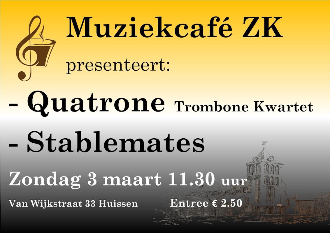 Op zondag 3 maart om 11.30u treden in het Muziekcafe ZK het Trombone Kwartet Quatrone en het jazzduo Stablemates op.