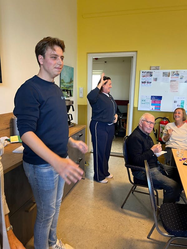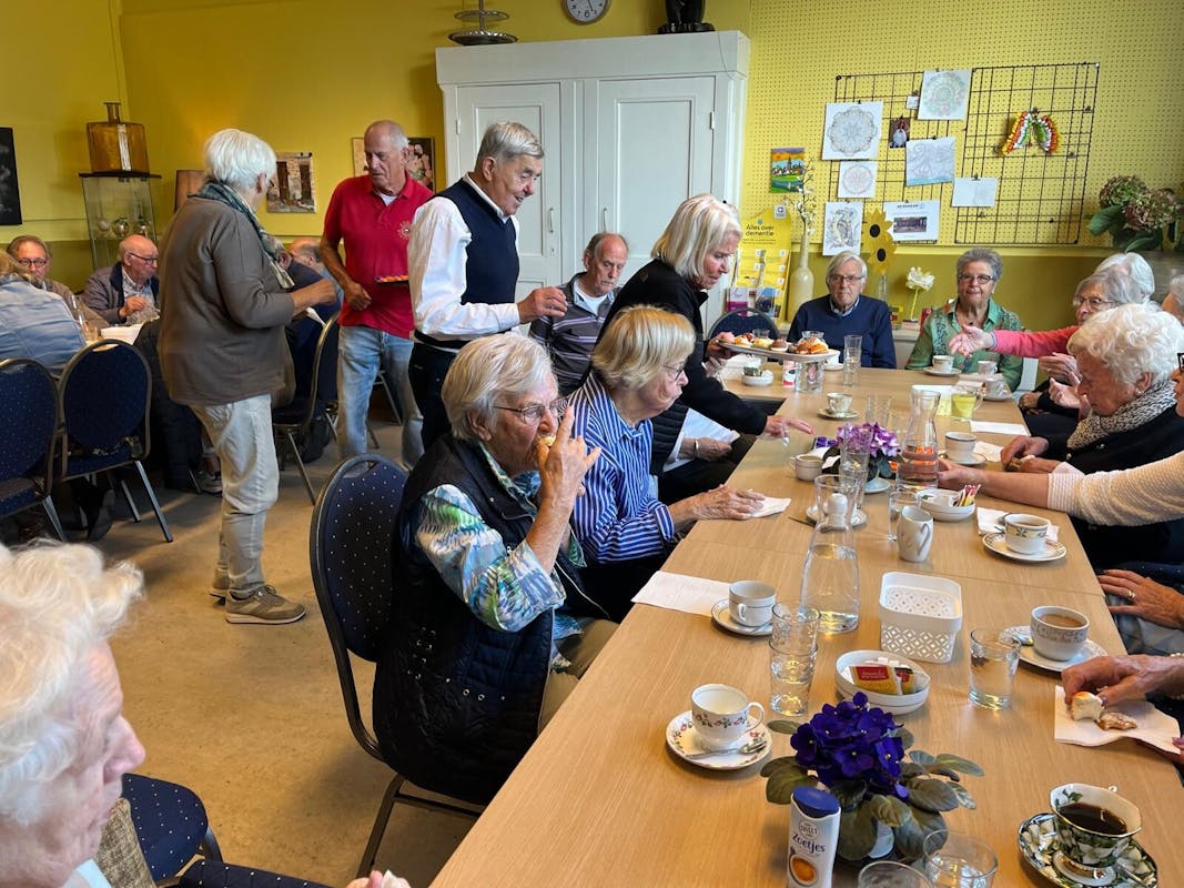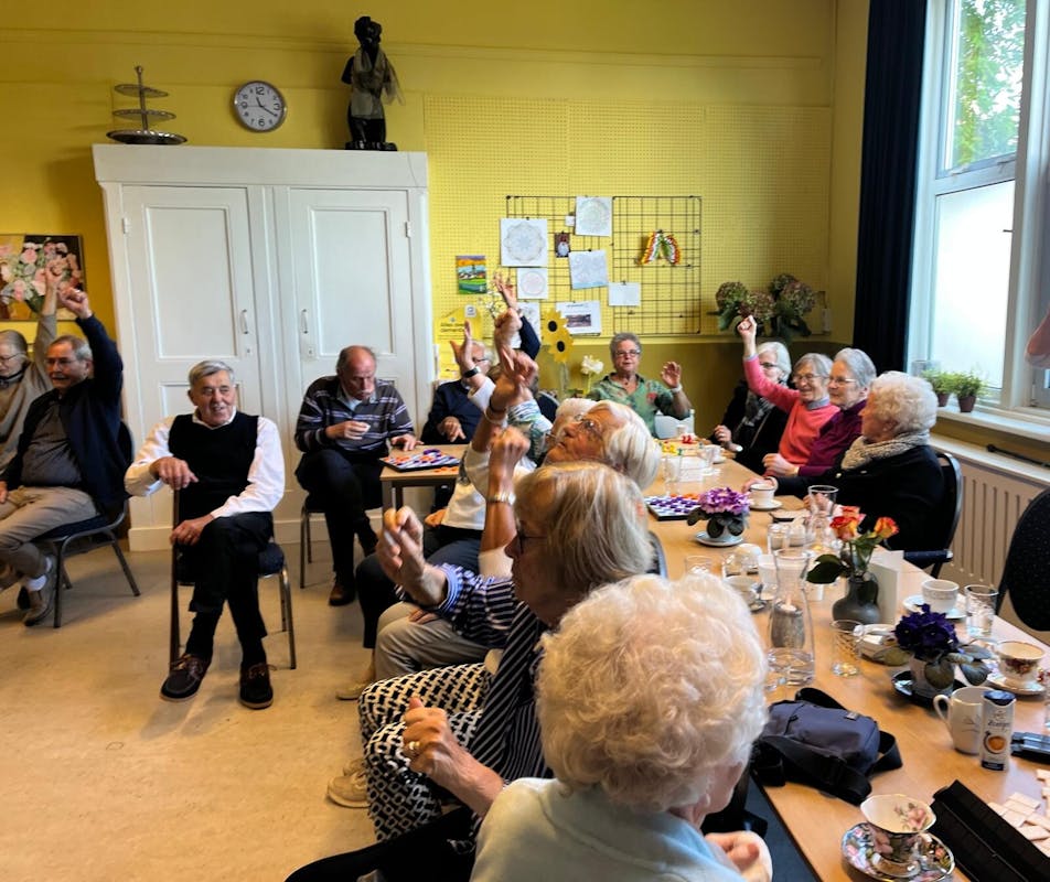 Terug in de huiskamer werden wij verrast door Cindy Roelofsen en Brennan Laurentzen vertegenwoordigers, van Sportservice Lingewaard, die een uitleg over het hoe en waarom te bewegen en ze lieten iedereen meebewegen. Of dit nou staand was of vanaf de stoel, het maakte niet uit. Iedereen was enthousiast en er parelde op menig voorhoofd een druppeltje van de inspanning. De activiteiten van deze ochtend vielen zo in de smaak dat werd voorgesteld om eens per een actieve ochtend te gaan houden. Het zou de Zandse Huiskamer niet zijn als er ook niet iets lekkers was voor onze bezoekers. Behalve de lekkere koffie en thee was er ook voor iedere bezoekers een gebakje en een heerlijk broodje kroket. Dat maakte dat iedereen vrolijk, voldaan en licht vermoeid weer naar huis ging. Tot de volgende week maandag tussen 10.00 uur en 12.00 uur.