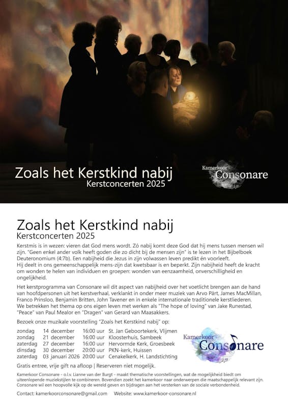 In december en januari brengt Kamerkoor Consonare haar nieuwe voorstelling " Zoals het Kerstkind nabij".