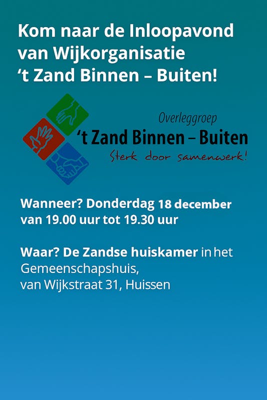 In onze wijk worden veel activiteiten georganiseerd door verenigingen en stichtingen waarbij vele vrijwilligers betrokken zijn. Toch krijgen wij ook regelmatig vragen van onze wijkbewoners over zaken die zij missen. Wij, de leden van de Wijkorganisatie ’t Zand Binnen – Buiten, willen hier graag iets mee doen en zijn zeer benieuwd naar welke zaken de inwoners van onze wijk gerealiseerd zouden willen zien.